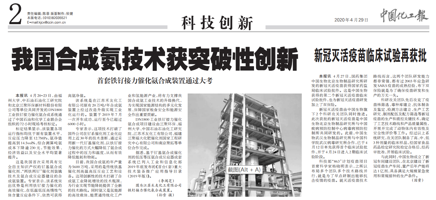 4月29日《科技日报》发表了记者马爱平《我国首套“铁钌接力催化”氨合成工业装置通过大考》的报道。