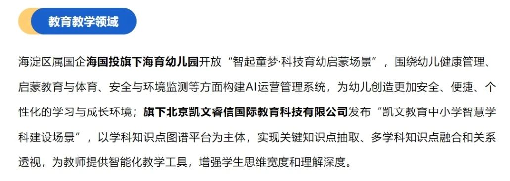 2024 年 9 月 26 日,在 2024 年北京市人工智能应用场景联合研发平台发布活动暨 2024 年北京市人工智能行业大模型创新应用大赛启动仪式上,中关村科学城发布了《人工智能全景赋能首批开放场景榜单》。该榜单面向具身智能、医药健康、教育教学、文旅消费等海淀区重点产业和民生领域。